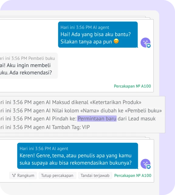 Saat kamu bekerja, agen AI Kommo langsung merapikan datamu. Ia melengkapi info leads dan menjaga CRM-mu tetap rapi — seperti manajer proyek yang selalu siap 24/7.