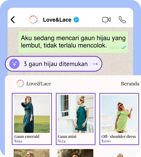 Agen AI kamu berbincang layaknya stylist asli — membantu pelanggan menemukan apa yang mereka cari, dari gaya gaun hingga opsi pengiriman.