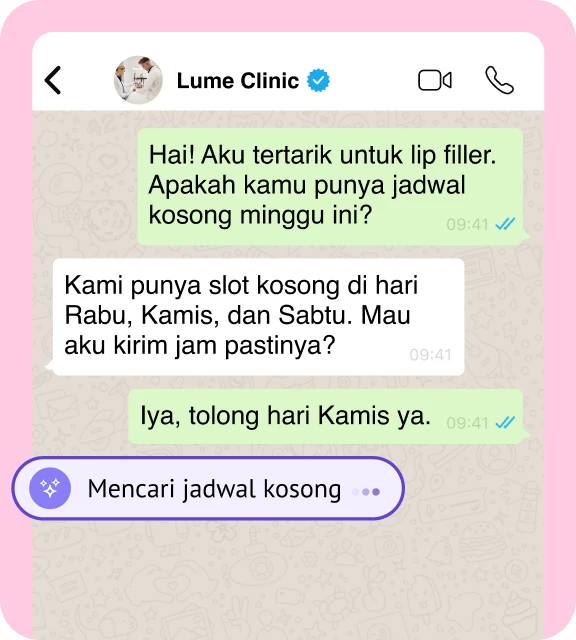 Tak perlu repot menelpon. Agen AI langsung mengatur jadwal, mengisi setiap slot, dan membuatmu fokus pada perawatan, bukan urusan kalender.